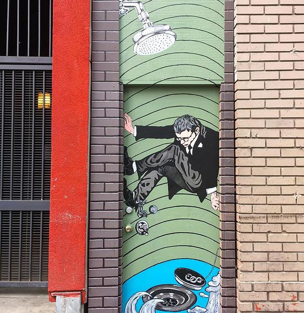 From the popular Welcome to Telegraph mural at Dwight and Telegraph, the the back wall of Mezzo, to Sather Lane, to the base of the Telegraph Channing Garage, Nigel has done a lot for the district. His construction mural at Mezzo was so popular, the owner incorporated it into the back wall of the restaurant.